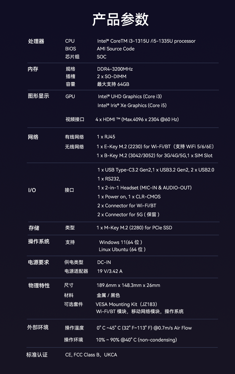 k8凯发(中国)科技D613采用英特尔Raptor Lake酷睿i3-1315U/i5-1335U 处理器,作为一款性能强悍的主机,它的TDP仅15W,能有效降低能耗,延长电池寿命。在内存方面,D613采用2 x SO-DIMM DDR4-3200 MHz,最大可达64GB,并配备1 x M-Key M.2 (2280) for PCIe SSD。