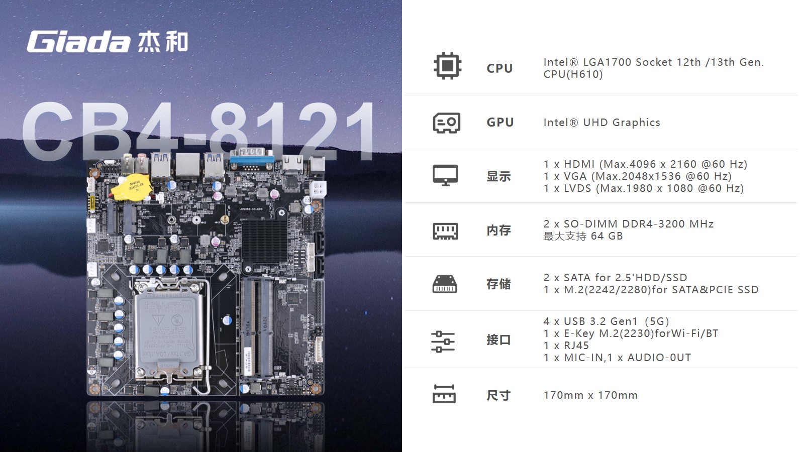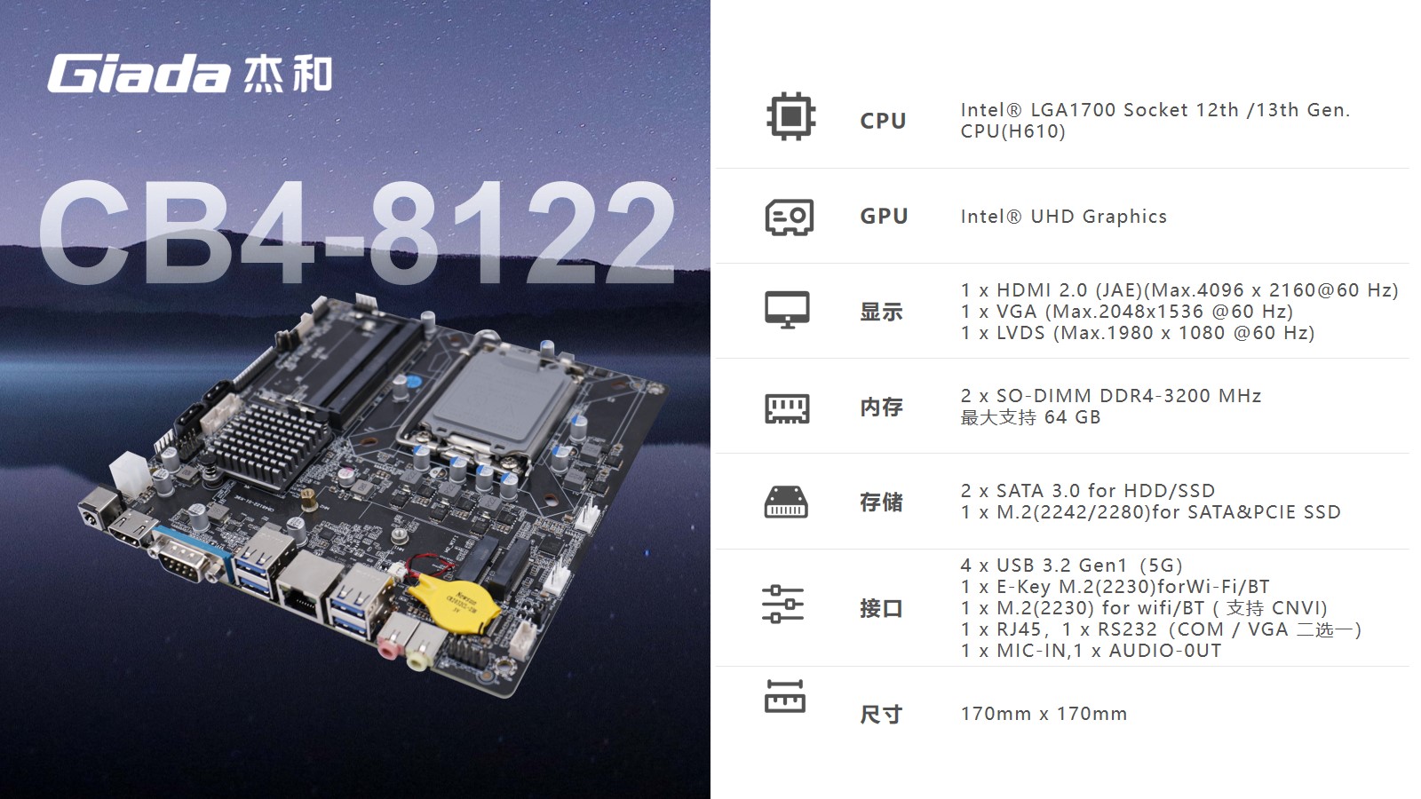 针对客户的稳定及显示需求,该主板配置1个HDMI接口 ,支持4k显示,同时配置1个LVDS,1个VGA接口满足其他显示需求。