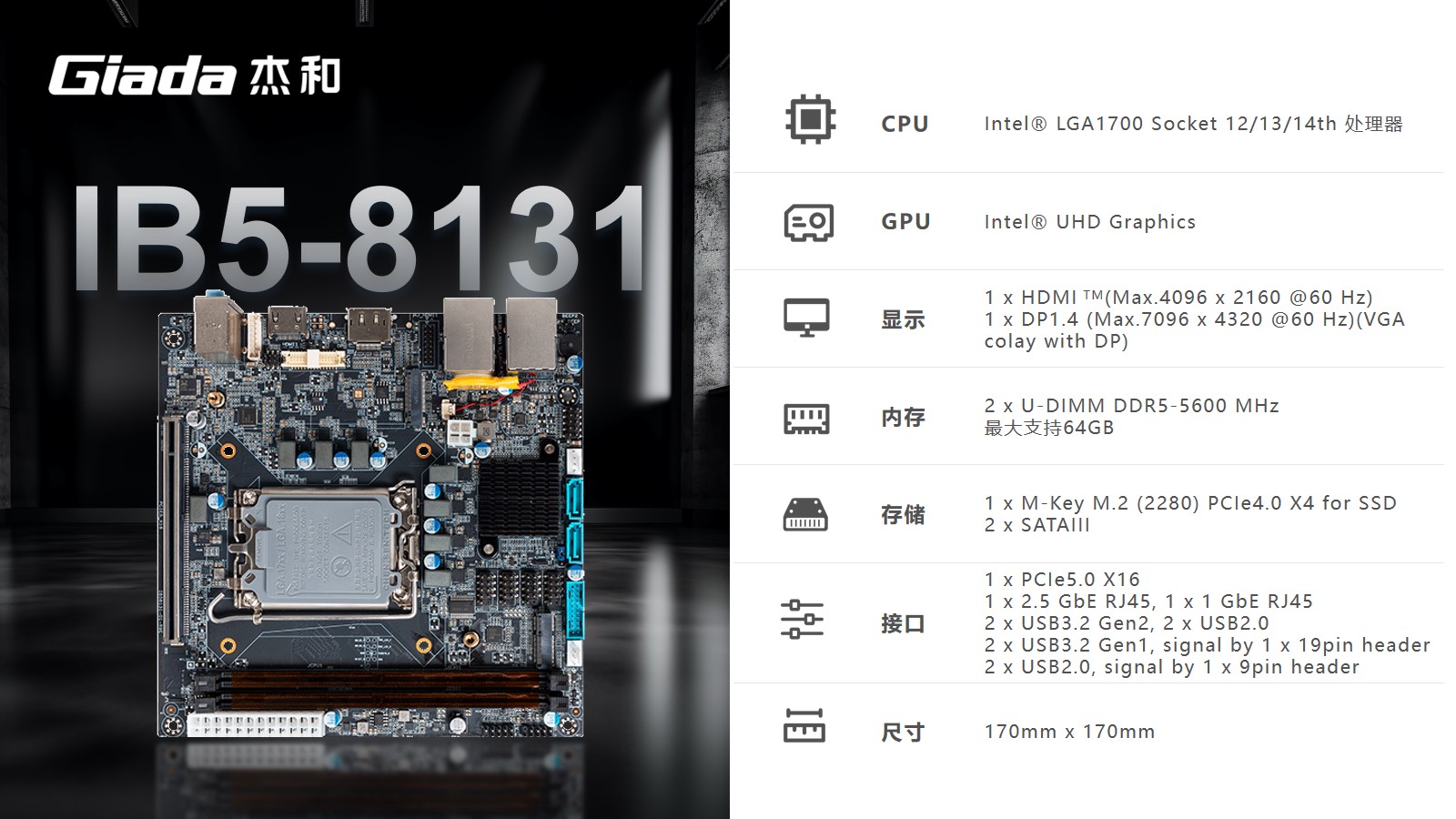 k8凯发(中国)Mini-ITX主板IB5-8131采用Intel® B760芯片组,支持Intel® LGA1700 Socket第12/13/14代CPU。支持1 x HDMI (Max.4096 x 2160 @60 Hz);1 x DP1.4 (Max.7096 x 4320 @60 Hz)(保留 VGA位置)。