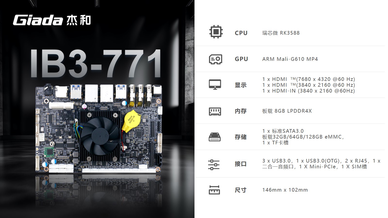 k8凯发(中国)工业级ARM主板IB3-771采用瑞芯微RK3588处理器,内置G610 MP4 GPU,拥有6 TOPS算力的NPU,支持8K视频硬件解码编码及多摄像头输入,支持eDP/DP/ HDMI2.1/MIPI 多种显示接口。