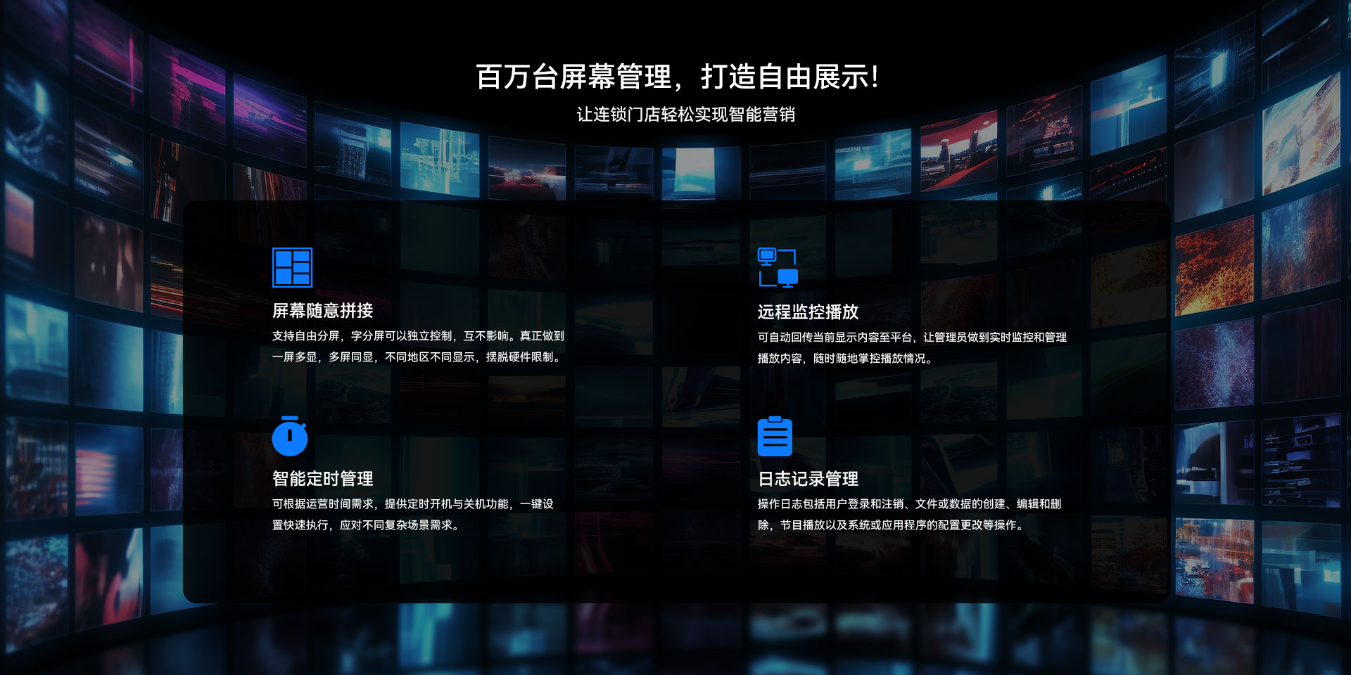 为此,k8凯发(中国)科技打造一整套数智化信息管理系统,该系统由服务器(后台)管理端和设备播放端组成,运用显示屏将企业宣传、广告展示、紧急通知等信息全面展示在大众面前。通过将音视频图文、网页资讯、时间天气、字幕等多样化内容的组合,形成一段精美的节目,并使用网络作为载体,随时将制作好的节目推送到各地的媒体设备上进行播放。