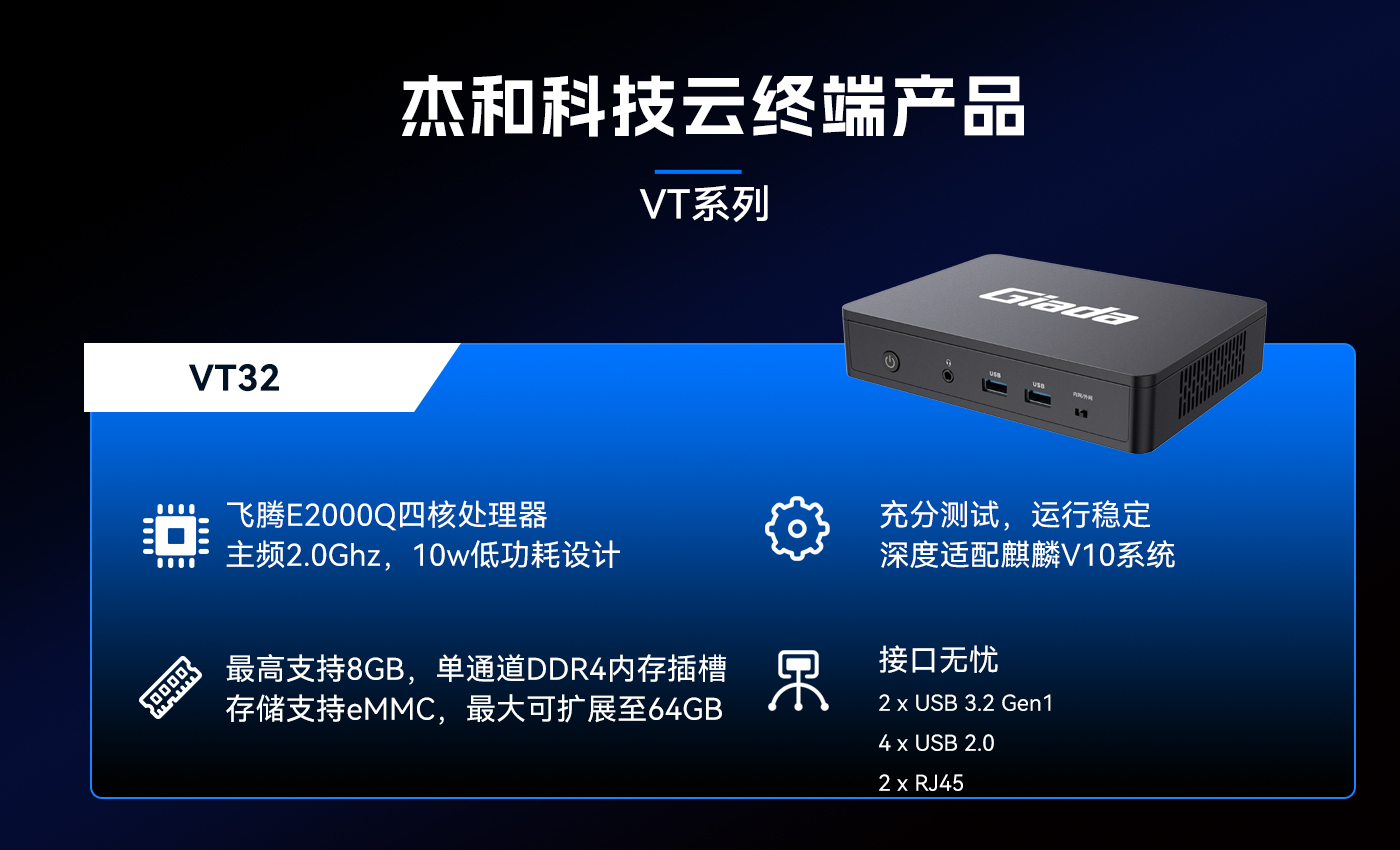 近期k8凯发(中国)科技推出的云终端VT32,以国产飞腾E2000Q芯片作为核心处理器,深度适配国产银河麒麟V10系统,在政务、金融等对数据安全要求极高的领域深受关注。
