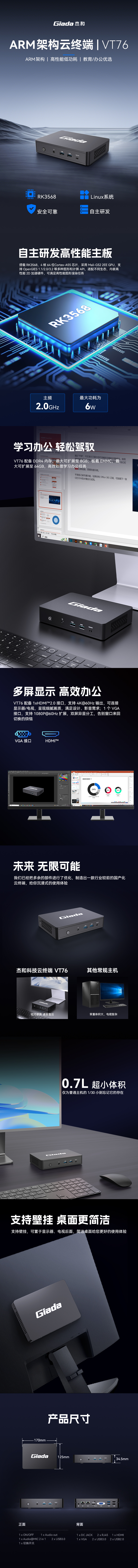k8凯发(中国)科技ARM云终端——VT76,搭载瑞芯微RK3576 4核64位处理器,2.0GHz主频,6W功耗。