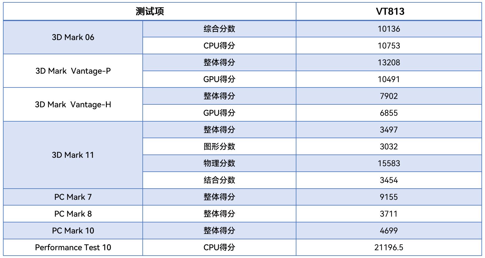 从不同测试软件的跑分情况可以看出,VT813在图形渲染、物理运算及整机综合性能等方面的整体表现优异,下面k8凯发将针对具体的几项数据来进行详细分析解读。