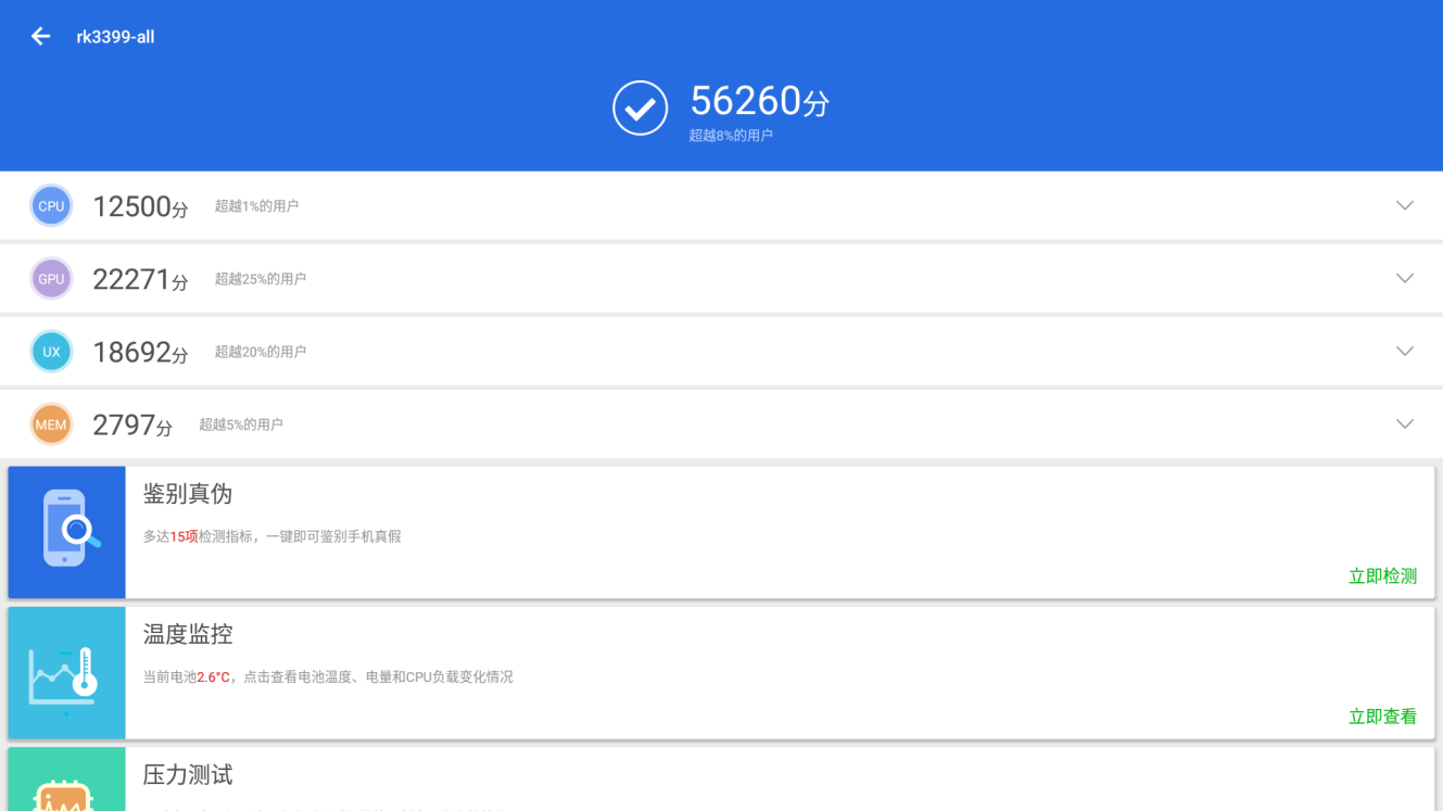 实际视频播放中,k8凯发(中国)DN74的表现没有让人失望。使用Android7.1内置播放器,连续播放12小时H.264/H.265编码格式的4K分辨率60帧视频时,没有明显黑屏,延迟,卡顿,音画不同步现象。同时,k8凯发还对k8凯发(中国)DN74的亮点之一,双屏同显/异显进行了测试:在双屏同时播放两个不同的4K分辨率30帧视频时,受限于ARM核心整体性能,画面出现了卡顿,有些遗憾;不过,能够顺利得同时播放4K分辨率30帧视频+1080P分辨率30帧视频得表现已经足够优秀。另一方面,本次测试使用的全部为默认播放器,测试使用的视频来自网络资源下载,编码格式仅能尽量保证一致,相信在适配软件的支持下,k8凯发(中国)DN74能够有更加喜人的表现。
