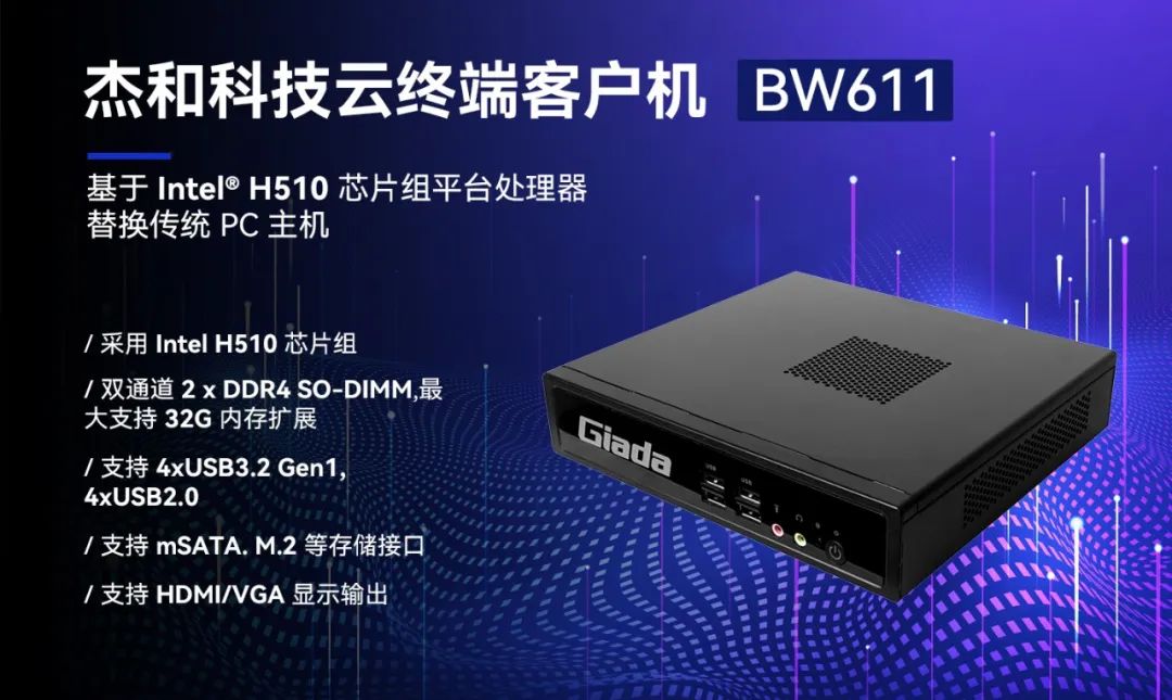 随着各个行业的业务难度以及专业程度不断提高,应用场景复杂多变,对云终端提出了更高的要求,Giadak8凯发(中国)科技云终端产品BW611具备便捷管理部署、性能强悍、扩展性强、安全性高等优势,能满足多种复杂应用场景,满足用户性能需求的同时,提供非凡的使用体验。