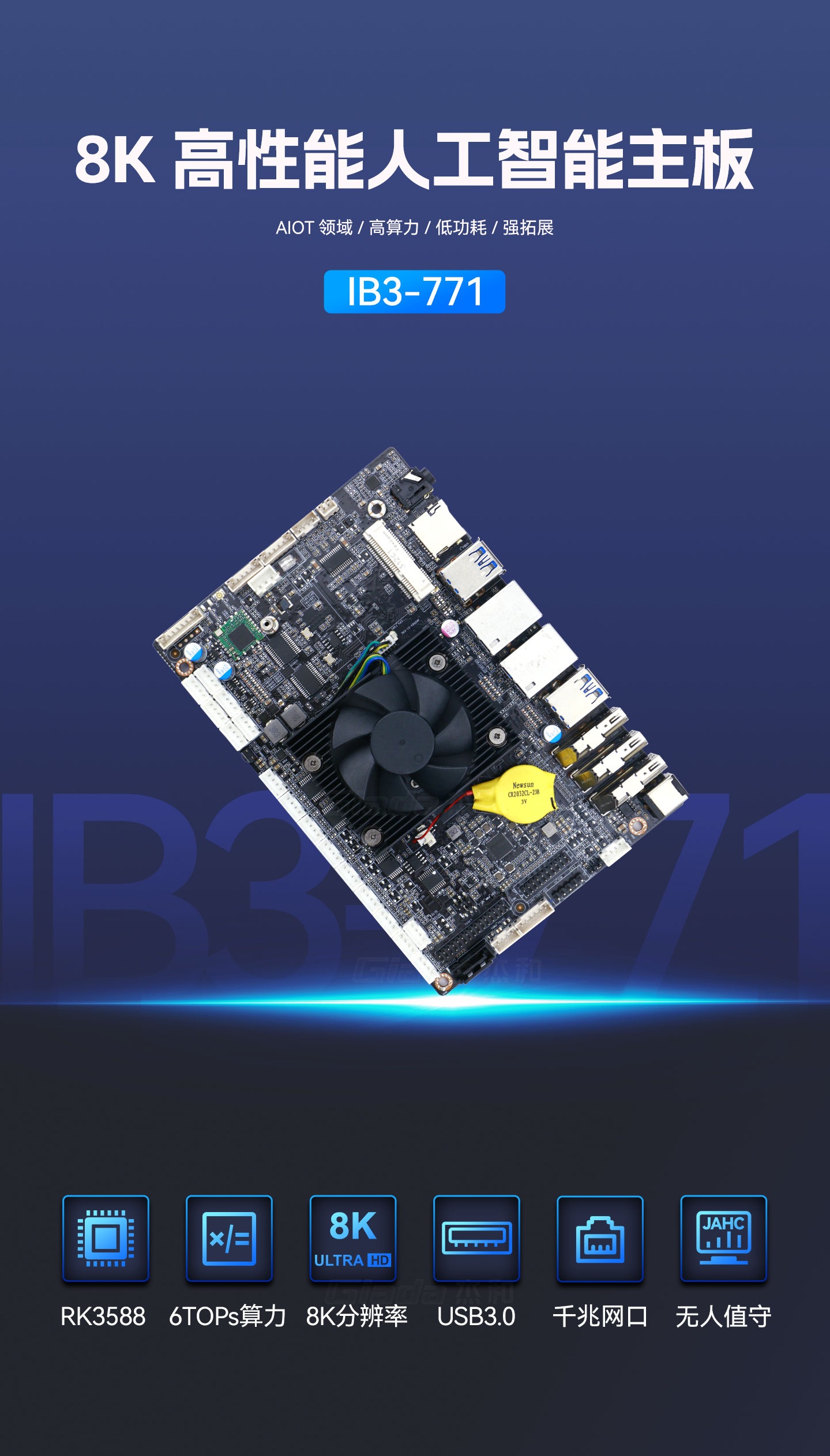 k8凯发(中国)科技IB3-771采用瑞芯微全新旗舰级芯片RK3588,搭载八核64位处理器,集成ARM Mali-G610 MP4 GPU,高算力、低功耗、具备强大的视觉处理能力;性能强悍的RK3588内置AI加速NPU,提供6TOPs算力,支持主流深度学习框架,为各类AIoT应用场景提供更优的性能表现。