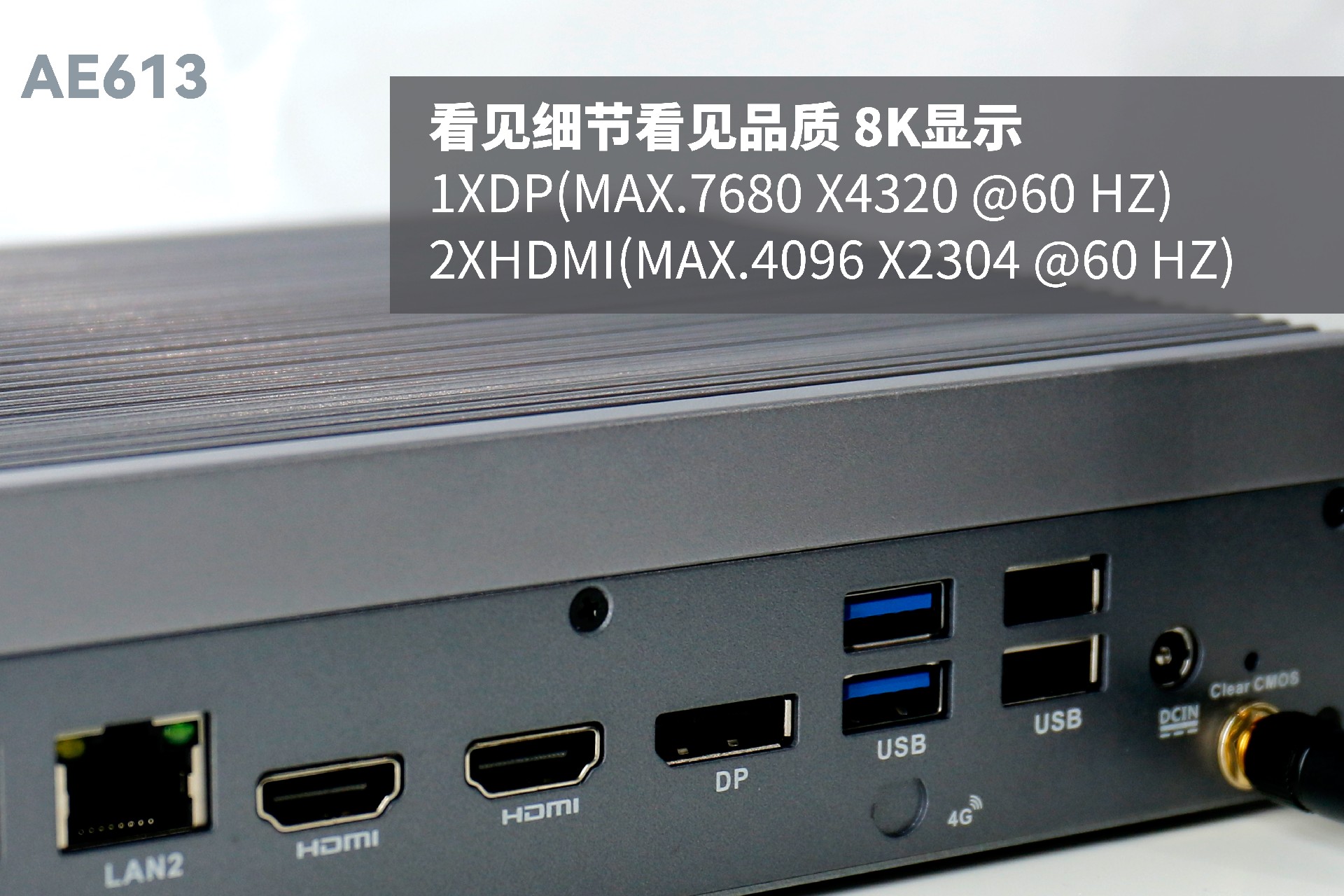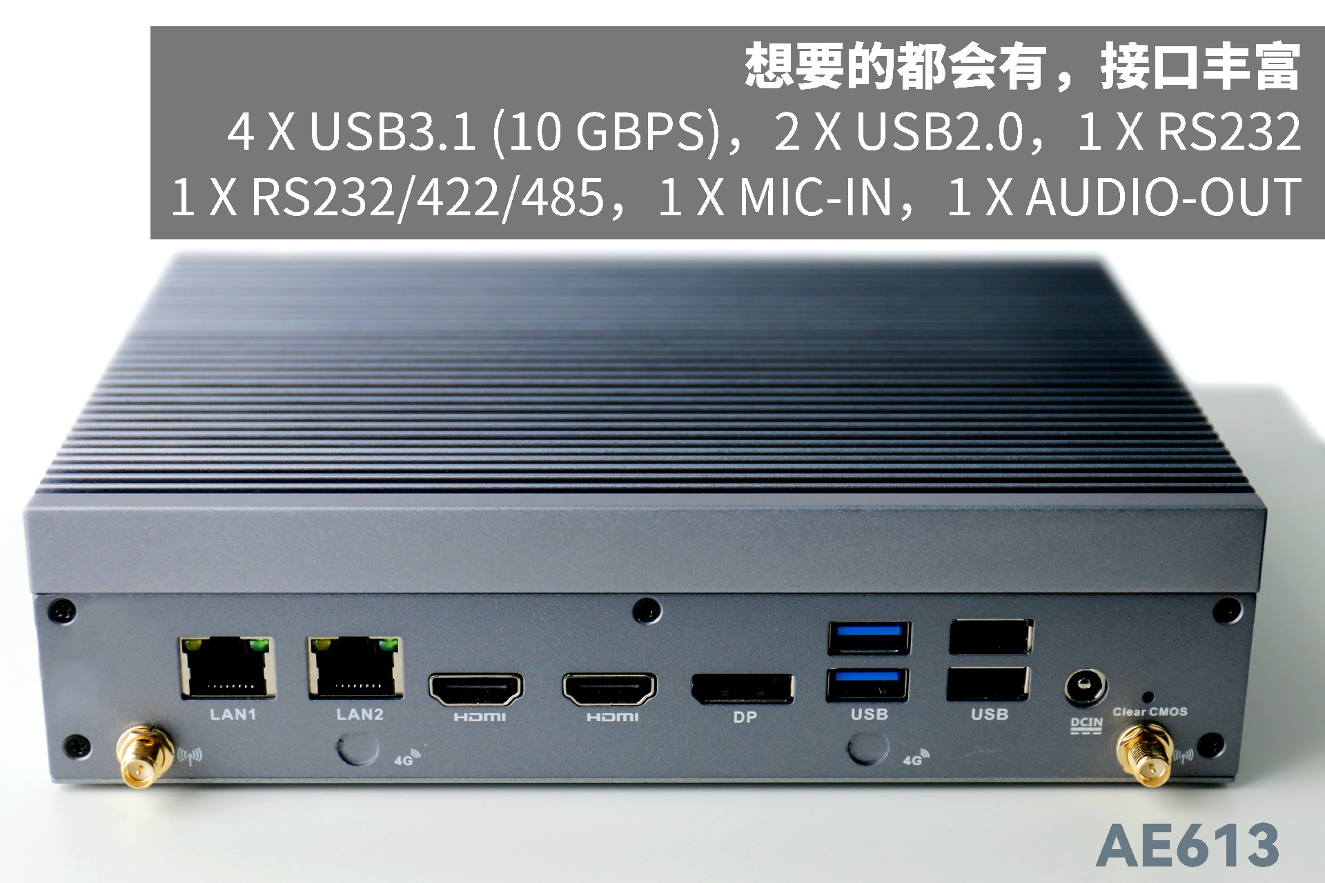 k8凯发(中国)AE613支持Windows 11 、Linux Ubuntu系统;拥有丰富接口:双千兆自适应RJ45网口,4 x USB3.1 (10 Gbps),2 x USB2.0,1 x RS232,1 x RS232/422/485,1 x MIC-IN,1 x AUDIO-OUT,帮助用户实现更多功能扩展;并且支持Wi-Fi 6E,可以提供更高的带宽和更少的干扰,支持对无线网络有特定需求场景的应用。
