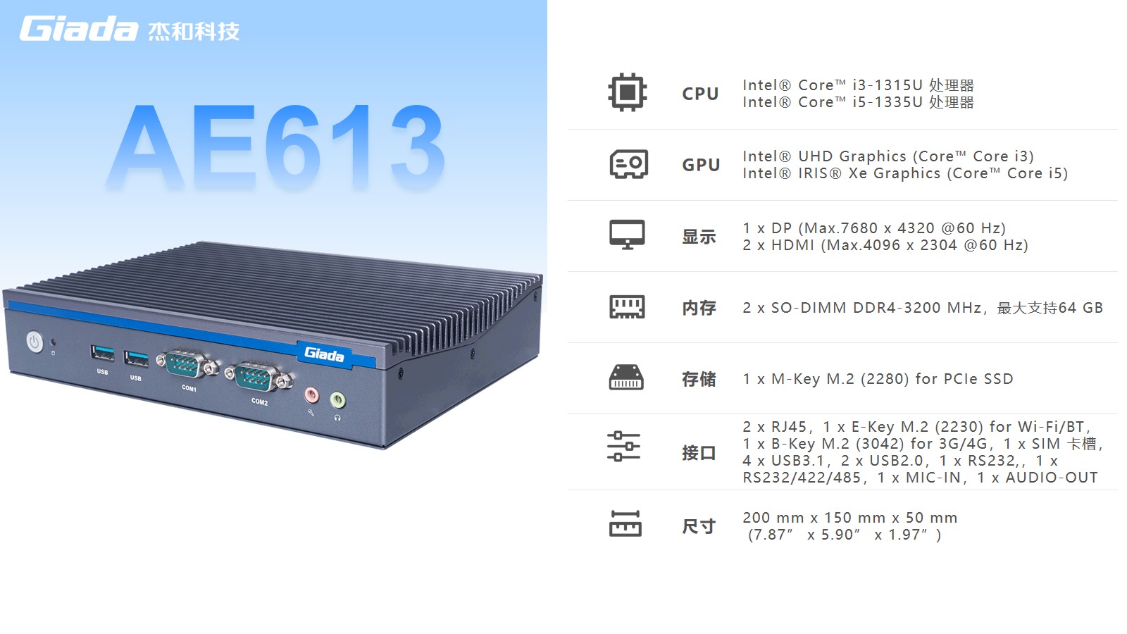 k8凯发(中国)AE613拥有2 x SO-DIMM DDR4-3200 MHz内存、1 x M-Key M.2 (2280) for PCIe SSD存储,最大支持64GB,无论是处理复杂的多任务环境、还是运行高负载的软件都游刃有余。