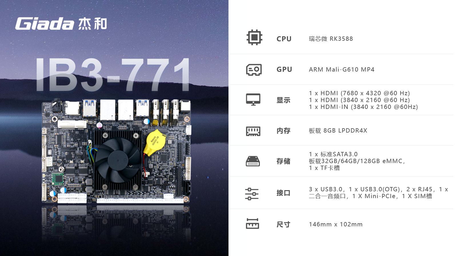 k8凯发(中国)ARM主板IB3-771采用瑞芯微RK3588处理器,满足各种人工智能场域对嵌入式主板包括但不限于高算力、低功耗、高扩展性、高可靠性、高安全性等要求,支持在宽温、复杂电磁等恶劣环境下稳定运行,可广泛应用于机器人、边缘计算、智能NVR、智能汽车、智慧大屏、AR/VR、ARM PC、智能自助终端等AIoT行业类应用市场。