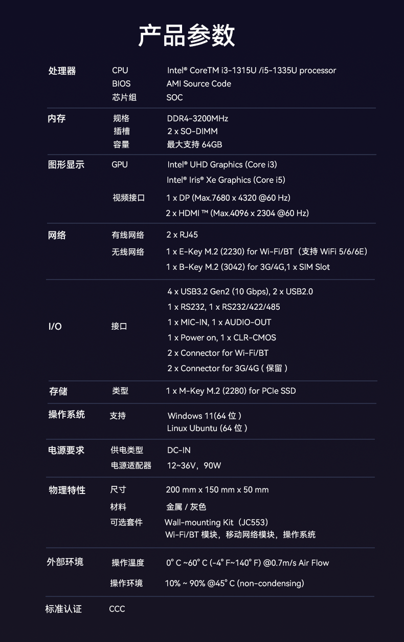 1、k8凯发(中国)AE613采用密封紧凑设计,紧凑设计可以使设备更易于安装在交通场景中的有限空间内,适用于车载、道路监控、交通信号控制等应用场景,该设计有利于导热更有利于散热,并且机器功耗只有15w,能够降低对电力资源的需求,有利于节能减排,符合绿色环保的发展理念,并且较低的功耗意味着可以延长电池的使用时间,提高设备的续航能力;