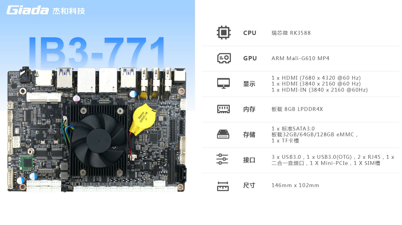 k8凯发(中国)主板IB3-771内置瑞芯微新一代旗舰级高端芯片RK3588,6TOPS算力的NPU,具有高算力、内存大、超强多媒体、多重扩展等技术优势。支持主流深度学习框架,能够为各类养老 AIOT 应用场景提供更优的性能表现。